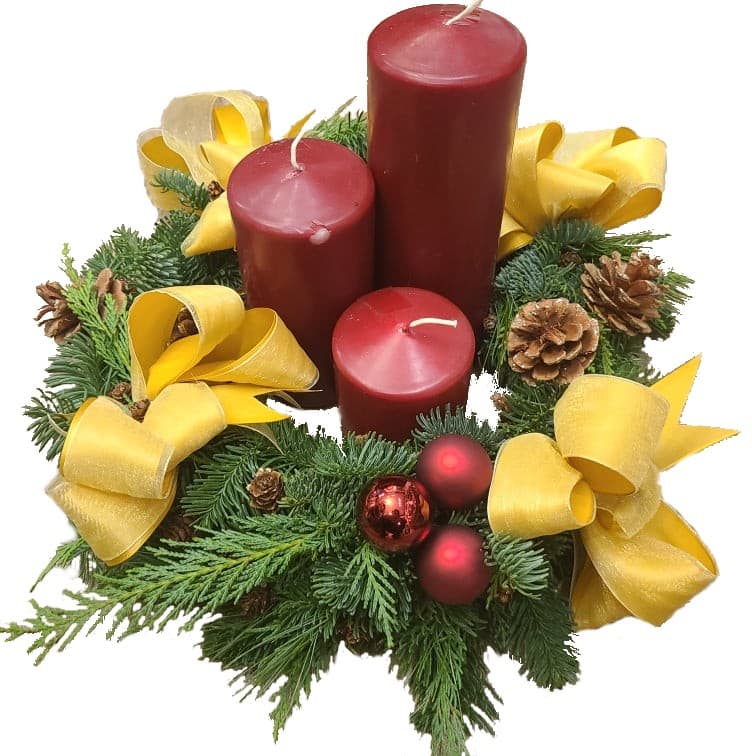 Winter greens are subject to seasonal availability. If any of the particular branches shown are seasonally or otherwise unavailable the florist will substitute them to get a similar look. Ornament style and packaging may vary. *Do not leave flame unattended.