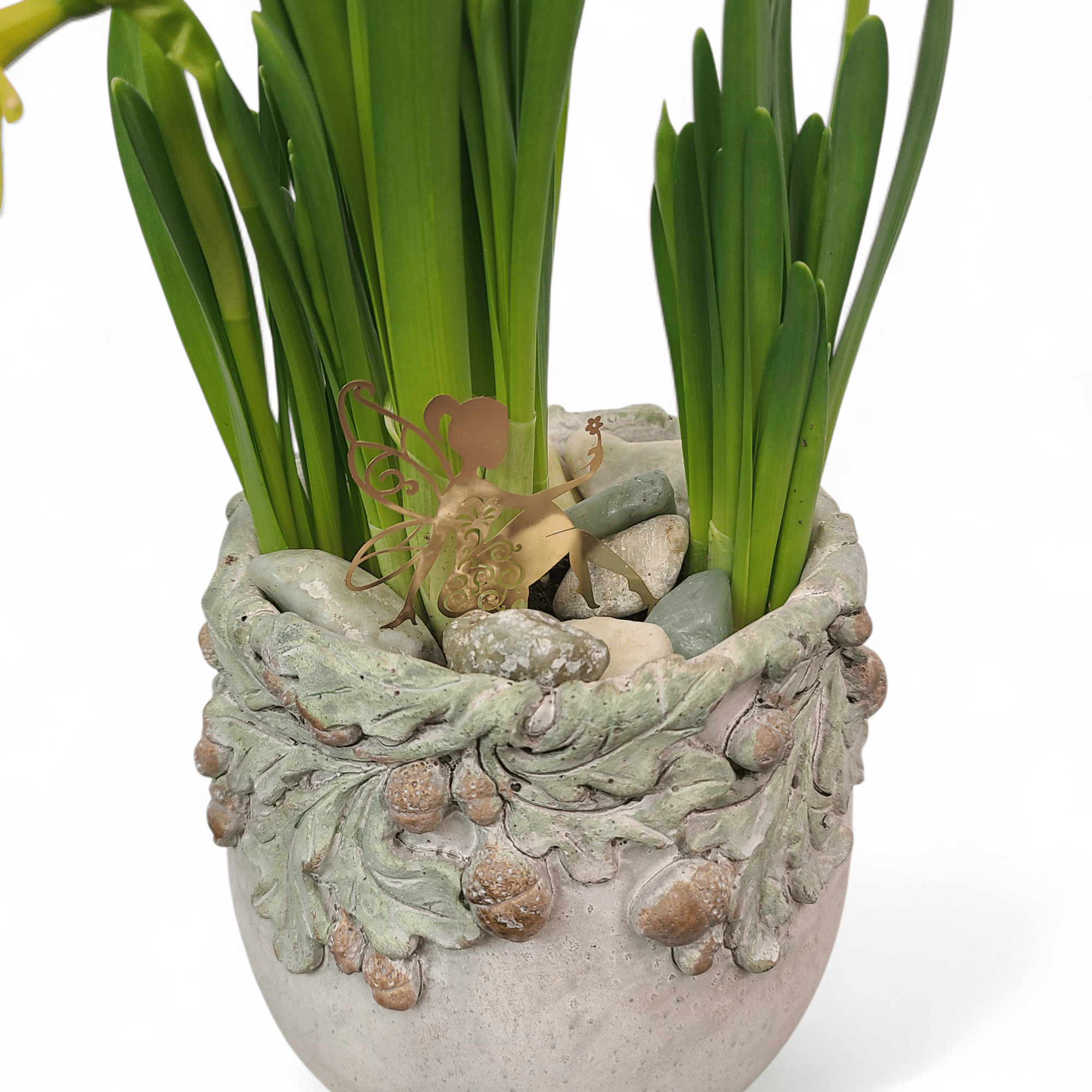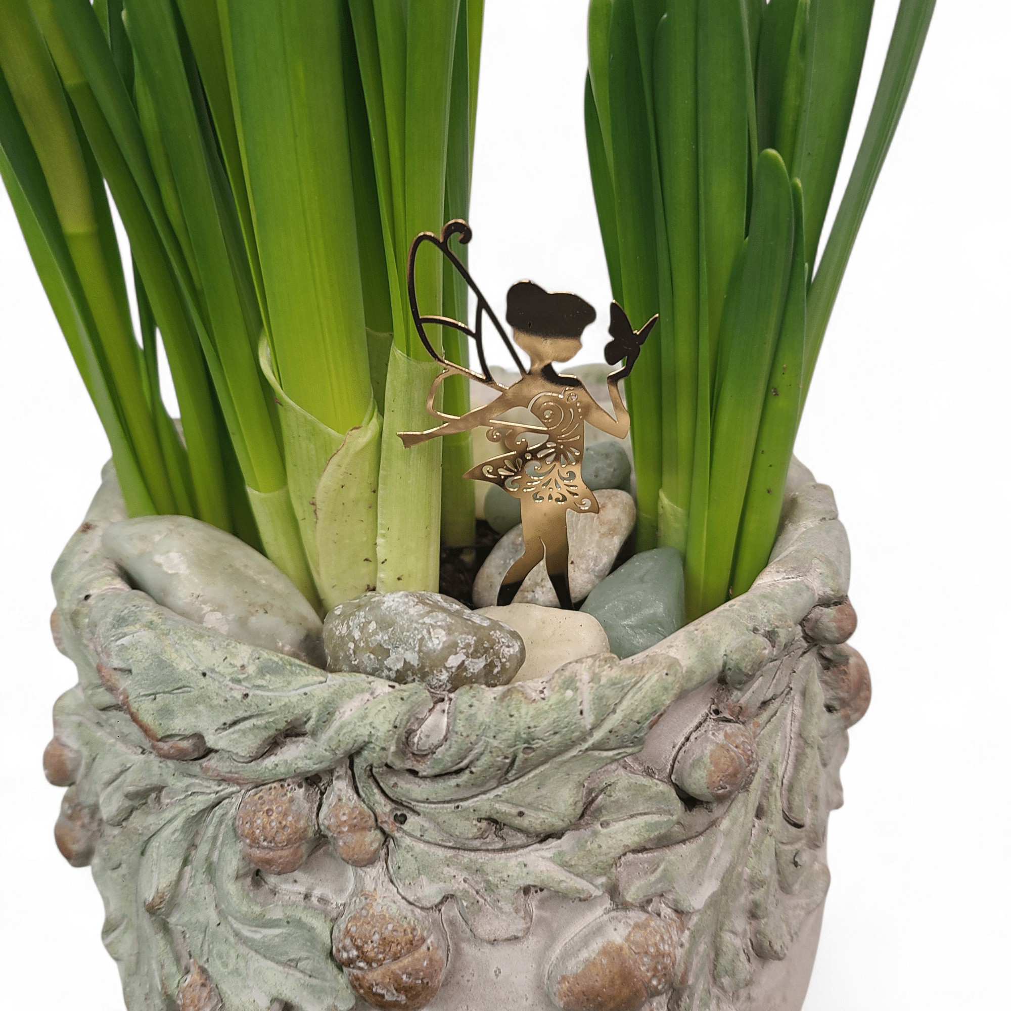 Each piece features a single seasonal bulb—hyacinth, daffodil, tulip, or iris—set in a textured stoneware, finished with natural river stones and a delicate fairy detail.